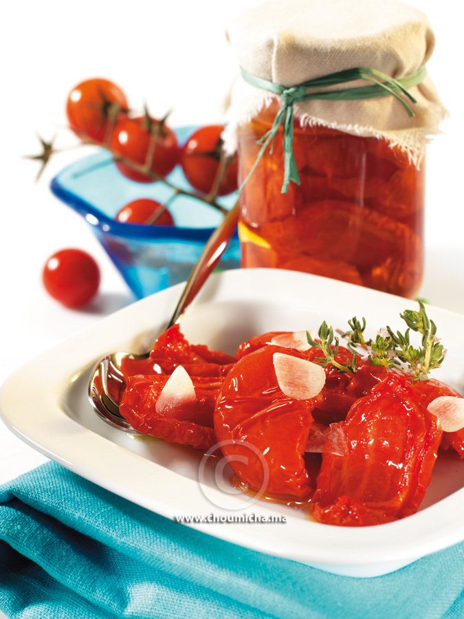 - يمزج زيت نوار الشمس و زيت الزيتون. تصفى الطماطم من الماء الذي أفرزته وتدهن بالزيت وتصفف فوق صفيحة مغطاة بورق المطبخ.