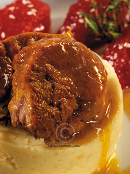 - نستعين بقالب صغير دون قاعدة لوضع دوائر عجين البطاطس في طبق التقديم، نضع فوقها قطع اللحم، تسقى بالصلصة الكثيفة والمصفاة وتقدم مرفوقة بكرات مربى الطماطم.