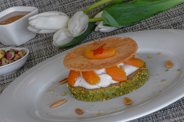 4- توضع العجينة في طبق للتقديم، تمدّ القشطة الطازجة فوقها ومن ثم يوضع كومبوت المشمش وأخيراً العثملية.