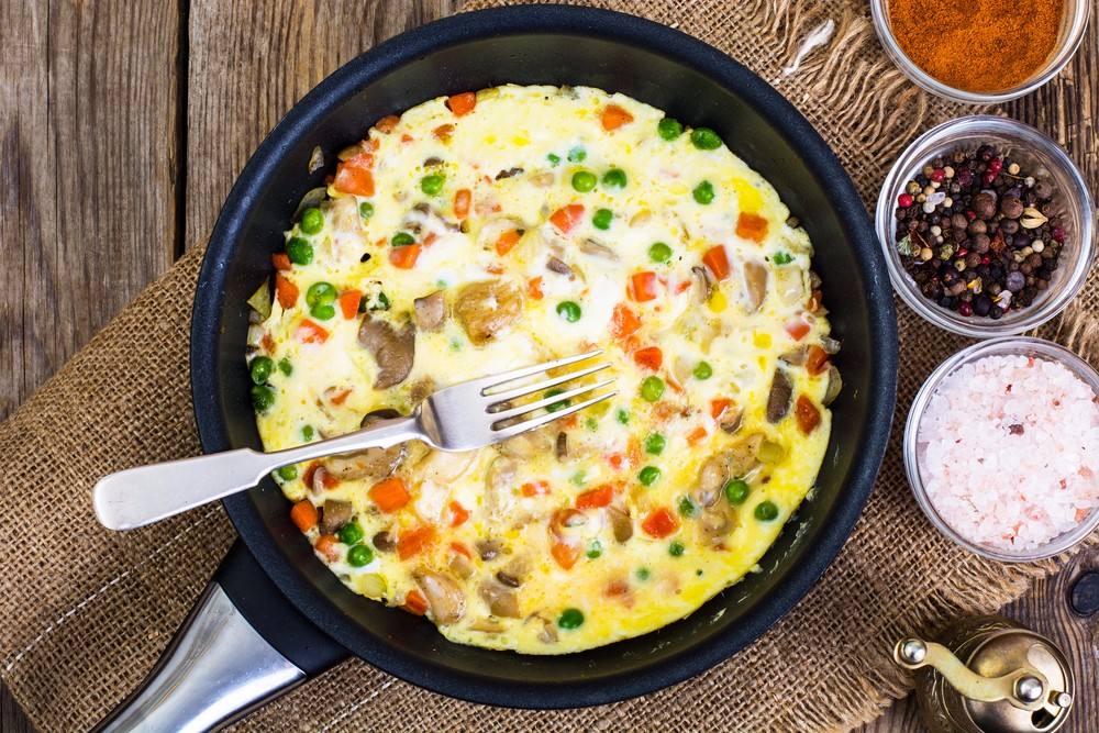 - يصب خليط البيض في المقلاة، ويوزع على المقلاة بالكامل.
