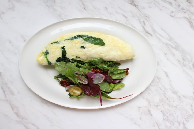 2. يُخفق صفار البيض في سلطانيَّة صغيرة، ويُنثر الملح عليه، ويُضاف برفق إلى مقلاة منفصلة حاوية على النصف الباقي من الزبدة، ويُطهى جيِّدًا. ثمَّ، يُوزَّع السبانخ المطهو في جانب من العجَّة، وجبن الماعز في الجانب الآخر منها، الجانبب الذي يُطوى بواسطة الملعقة، لتتخذ العجَّة هيئة نصف القمر.