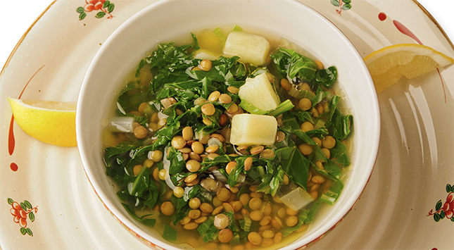 في‭ ‬نصف‭ ‬كمية‭ ‬زيت‭ ‬الزيتون‭ ‬يشوح‭ ‬البصل‭ ‬لمدة‭ ‬3‭ ‬دقائق،‭ ‬ثم‭ ‬تضاف‭ ‬البطاطا‭ ‬وتطهى‭ ‬لمدة‭ ‬دقيقتين،‭ ‬ثم‭ ‬يضاف‭ ‬العدس‭ ‬المغسول‭ ‬ويغمر‭ ‬الكل‭ ‬بالماء،‭ ‬ثم‭ ‬يضاف‭ ‬السلق‭ ‬ويترك‭ ‬الخليط‭ ‬على‭ ‬النار‭ ‬لمدة‭ ‬20‭ ‬دقيقة‭ ‬تقريبًا‭ ‬حتى‭ ‬ينضج‭ ‬العدس‭ ‬والبطاطا‭. ‬