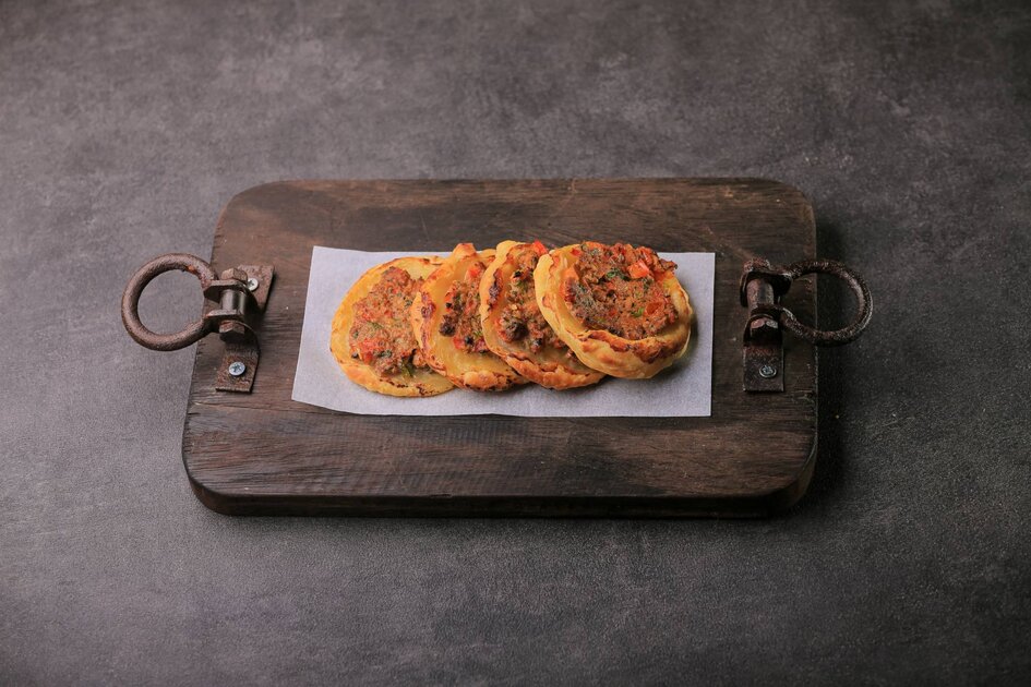 توضع مقادير العجينة معاً وتمد 2 ملعقة من اللحم على العجينة، تخبز في الفرن على حرارة 220 درجة مئوية لـ10 دقائق.