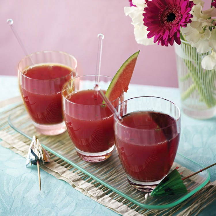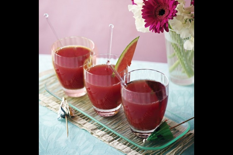 1- في الخلاط الكهربائيّ، يضرب كلّ من قطع البطيخ وأوراق النّعناع.
