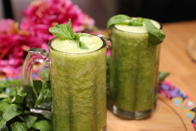 4. أضيفي كوب الريحان الطازج، واخلطي المكونات جيداً حتى يتشكل لديك عصير متجانس.