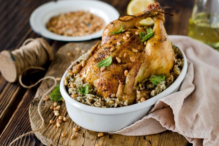 10. ونضع الدجاجة المحشوة في طبق التقديم.