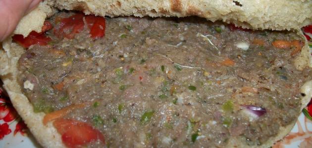 - نفرد كرات العجينة بالنشّابة، ثم نضع كميّةً من اللحم على قرص العجينة، ونوزعها جيداً.