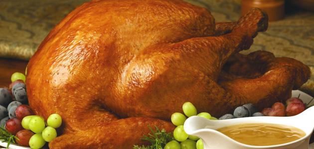 - دهن الديك الرومي من الخارج بالزبدة المذابة ورشه بالملح والفلفل.
