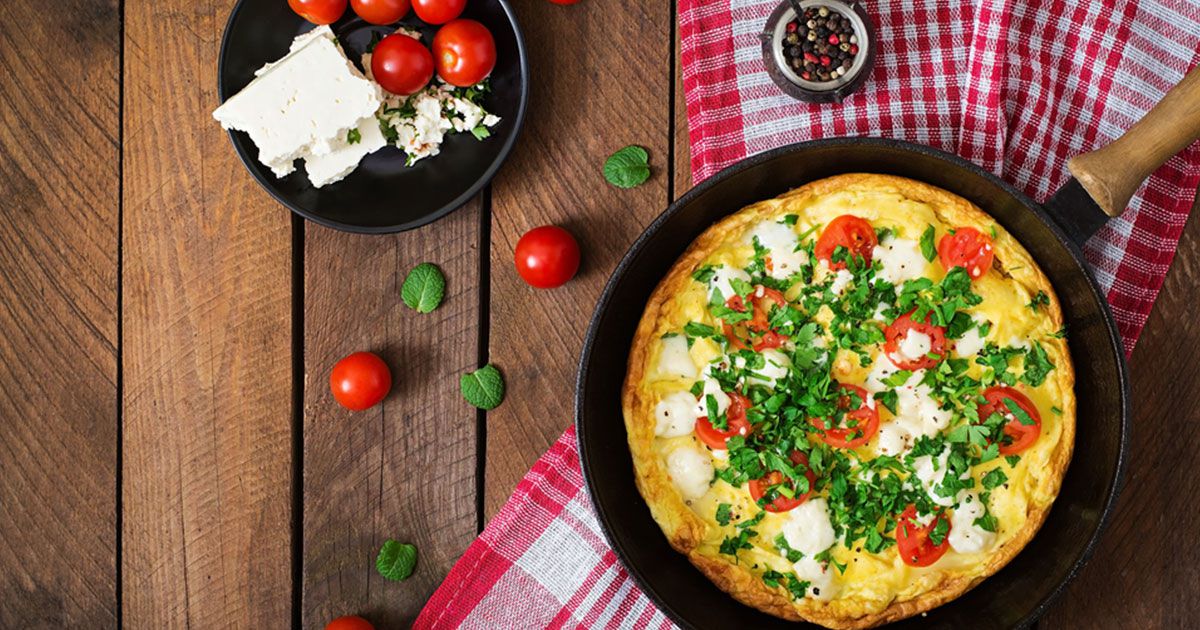 1- في وعاء، ضعي البيض ونكهي بالملح والفلفل الأسود. 2- أخفقي المكونات جيداً. 3- في مقلاة واسعة على نار متوسطة، حمي الزيت النباتي ثم ذوبي الزبدة. 4- أضيفي البيض واتركيه على نار خفيفة لحوالى 3 دقائق ثم أقلبي الخليط إلى الجهة الثانية. 5- أضيفي الطماطم وجبن الفيتا ثم غطي المقلاة واتركيها على نار خفيفة حتى ينضج البيض. 6- ارفعي المقلاة عن النار وزيني وجه البيض بالبقدونس. ألف صحة!!