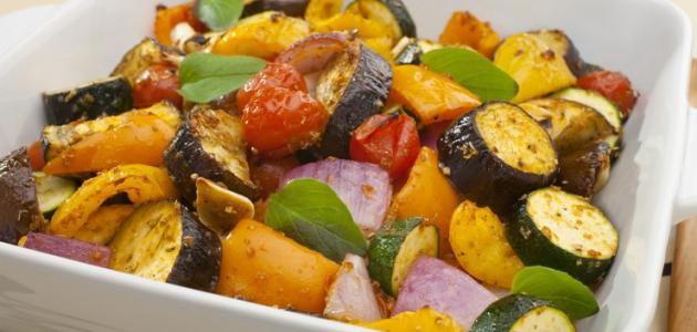 - وضع الفليفلة، والكوسا، والباذنجان، والبصل، والبندورة في صينية الفرن، وتتبيلها بالملح والريحان وتقليبها جيداً.