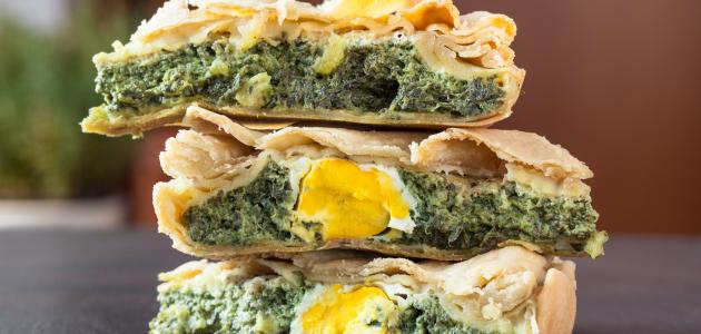 - نقسم العجينة إلى قسمين ، نضع القسم الأول بالصينية بعد دهن الصينية بالزبدة من ثم نضع قسم من العجين بالصينية ، بعد ذلك نضع الحشوة من ثم نضع القسم الثاني من العجين و نفرده على السبانخ.