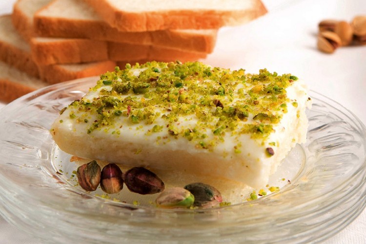 7. يرشّ الفستق على الوجه بالتساوي قبل الأكل بقليل.
