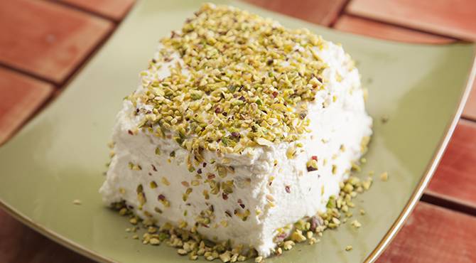التجميع: ترص شرائح الخبز فوق بعضها بعضاً، تغطى بالقشطة والفستق الحلبي المطحون، توضع في البراد ويقدم بارداً مع شراب السكر على الجانب.