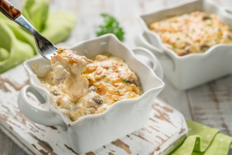 4. تذوب الزبدة في مقلاة على حرارة متوسِّطة، ويُضاف الفطر إليها، مع التقليب برفق، وذلك لنحو خمس دقائق. وعند ملاحظة أن الفطر أمسى ناعمًا، ينثر الملح والفلفل، ويخلط الفطر مع الدجاج، ويبقى الخليط على النار لدقيقتين.