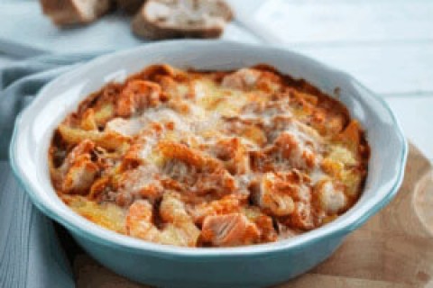 - تُرشّ جبنة البارميزان فوق المزيج وتُخبز في الفرن لمدّة 35-45 دقيقة أو إلى أن تنضج الباستا وتصبح ذهبية قليلاً عند السطح.