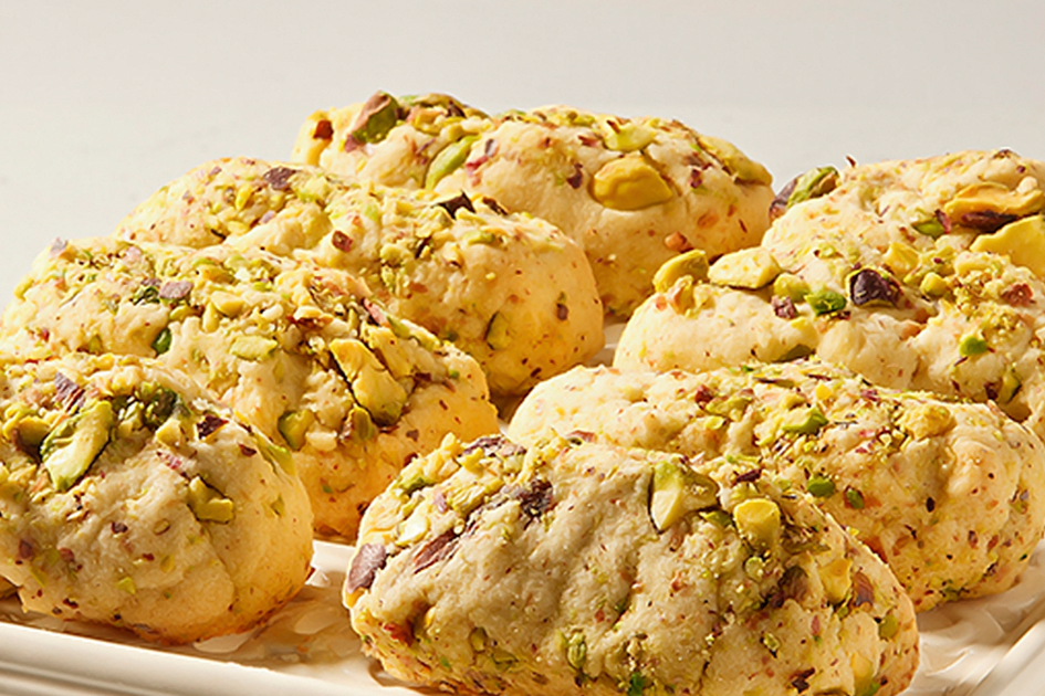 نقطعها قطع صغيرة ونضغطها براحة الكف ونضعها في صينية ونضع على كل واحدة حبةمن الفستق في جهة واحدة ونحاول أن نعمل في وسطها حفرة بواسطة الإصبع الصغير-نضعها في الفرن حتى يصبح لونها من الأسفل ذهبي فاتح ويبقى لونها من فوق أشقر