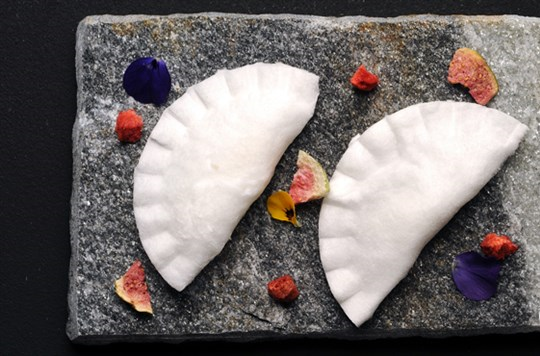 - تُحشى قشرة الحليب بـ½ ملعقة صغيرة من خليط القشطة وتُطوى مثل الرافيولي.