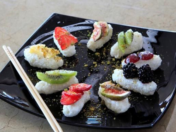 2. يوضع الأرز بالحليب في وعاء حتى يبرد، ومن ثم تشكّل منه أصابع على شكل “السوشي” وتزيّن بقطع من الفاكهة الصيفية المنوّعة.