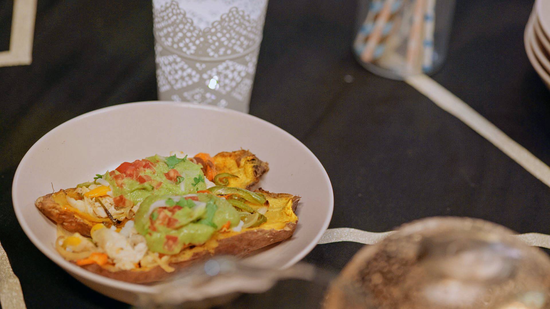 يتم تقسيم البطاطا الى نصفين مع ترك مسافة من اللحم بسيطة على الجوانب.