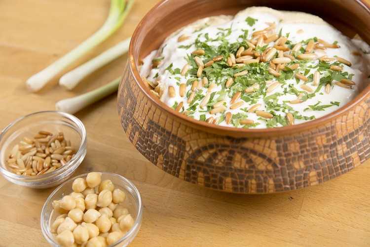 - ضعي الخبز في طبق تقديم، وزعي فوقه قليل من ماء الحمص.