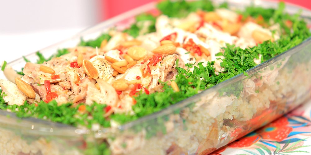 - يحمر الدجاج ويوضع فوق الرز ويزين باللحمة المفرومة واللوز والبقدونس و يقدم بجانب الدقة الحارة .