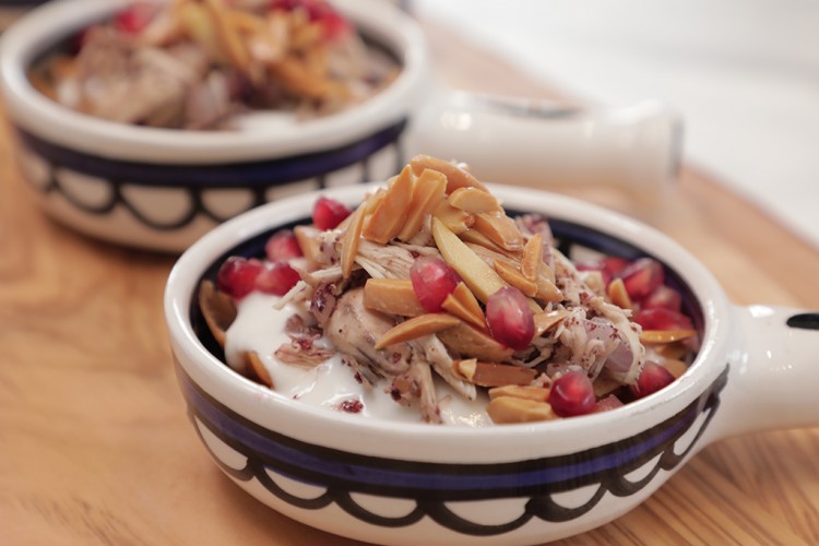 5. للتقديم: وزعي الخبز المقطع والمقلي بقاع أطباق التقديم، أضيفي من صوص اللبن، ووزعي الدجاج. زيني باللوز والرمان بحسب الرغبة.