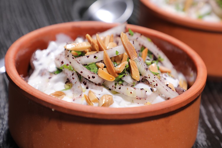 5. للتقديم: ضعي الخبز المحمص في قاع طبق التقديم، أضيفي من خليط الدجاج والبصل، ثم من مزيج اللبن الزبادي، وزيني بشرائح البصل مع البقدونس والسماق، واللوز المحمص وزيت الزيتون.