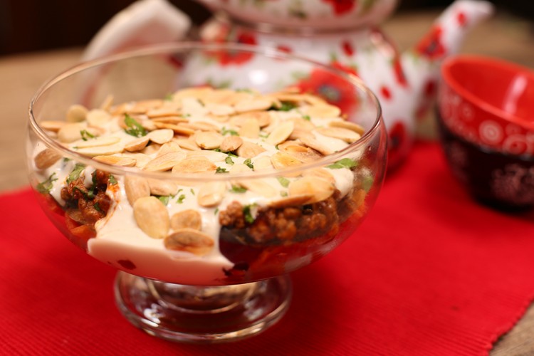 3. للتقديم: ضعي الخبز المقلي بقاع طبق التقديم، وأضيفي الباذنجان المقلي، ثم وزعي خليط اللحم المفروم، ثم وزعي صلصة الطحينية، وزيني بالبقدونس المفروم، واللوز.