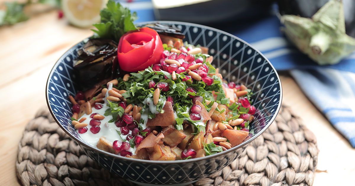4- في طبق التقديم، ضعي القليل من الخبز، الباذنجان وبقدونس، الرمان والزبادي. أعيدي الكرة حتى تحصلي على 3 طبقات مماثلة.