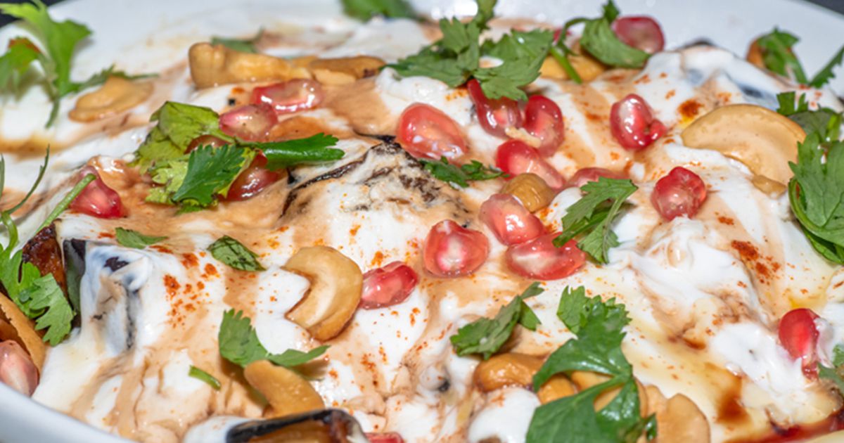 5- أسكبي صلصة اللبن فوق الباذنجان. زيّني بالكاجو، الرمان، البابريكا والبقدونس.