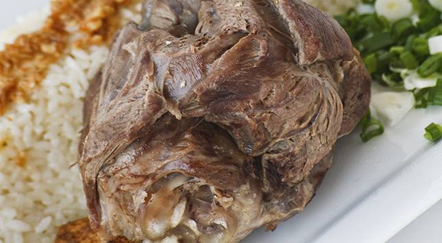 يُقدم مع الأرز الموضوع على وجهه الخبز واللحم.