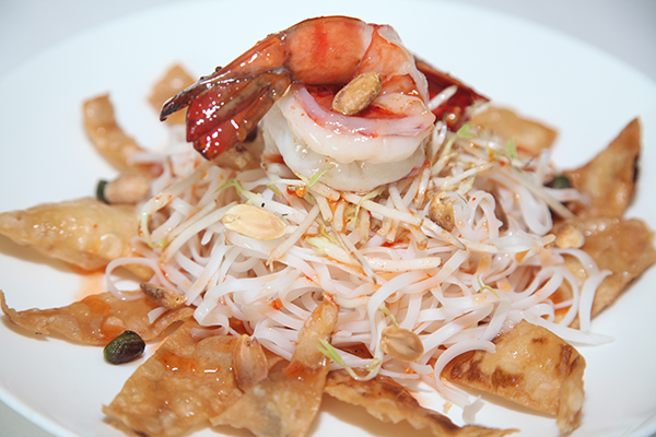 2. ضعي الخبز وفوقه النودلز المسلوق، ثم أضيفي إليه الروبيان وبراعم الفول وأضيفي صلصة الفلفل الحلوة، وزيني بالفستق السوداني والكزبرة الخضراء.