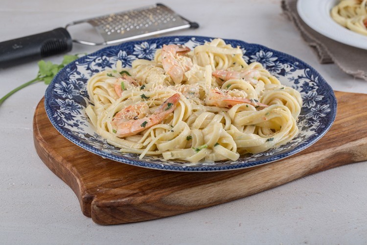 4. يُعاد الروبيان للمقلاة، ويُضاف الـ”فيتوتشيني” المسلوق، مع التقليب جيِّدًا. ثمَّ، يُصبُّ ربع الكوب من ماء سلق الـ”فيتوتشيني”، ويوزَّع الجبن المبشور والكزبرة المفرومة.