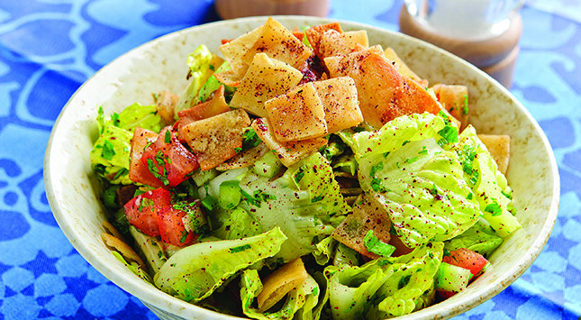 - 1 رغيف من خبز البيتا، محمص ومقطع إلى مكعبات