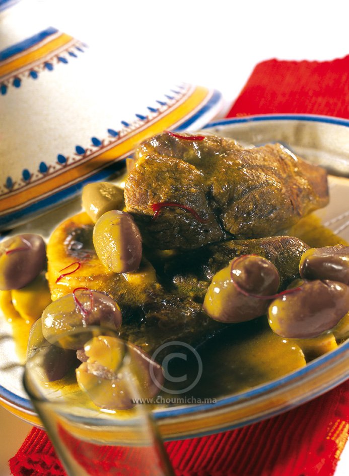 - تصفف قطع اللحم في طبق مسخن، تزين بالزيتون وتسقى بالمرق.