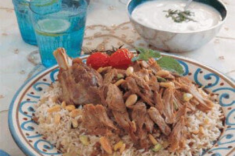 5. يُسكب الأرز في طبق لكي يُقَدَّم. يُسحب عظم لحم الغنم ويُنسَّق اللحم فوق الأرز ثم يُزيَّن الطبق بالمكسرات المقلية. ويُقدَّم مع الزبادي السادة جانبًا.