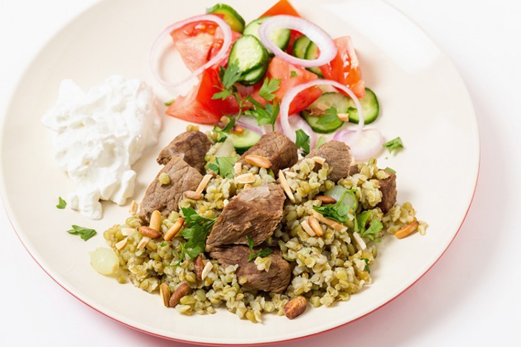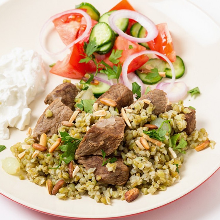 8. تُزيّن الفريكة مع اللحم بالمكسّرات، وتُقدّم مع الزبادي وسلطة الخضراوات.