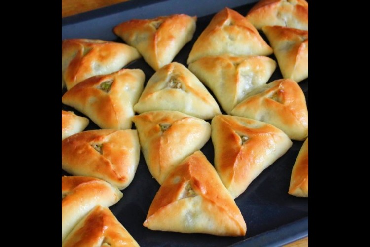 - مدي دوائر العجين ووزعي الحشوة عليها ولفيها على شكل مثلث محكم الإغلاق من كل الجوانب.