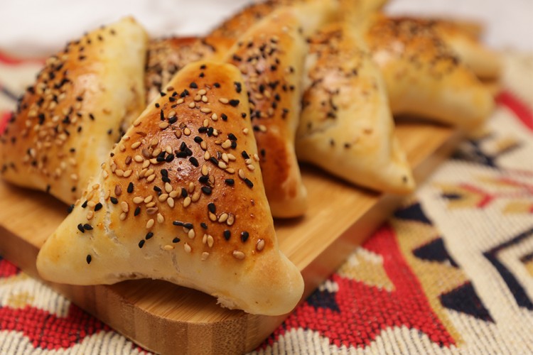 4. احشي العجينة بخليط الحشوة، ثم أغلقيها على شكل مثلثات.
