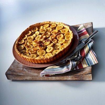 يتم إخراج الفطيرة ثم يتم تقطيع الموز ثم يتم تسخين الزبدة في مقلاة ويقلى