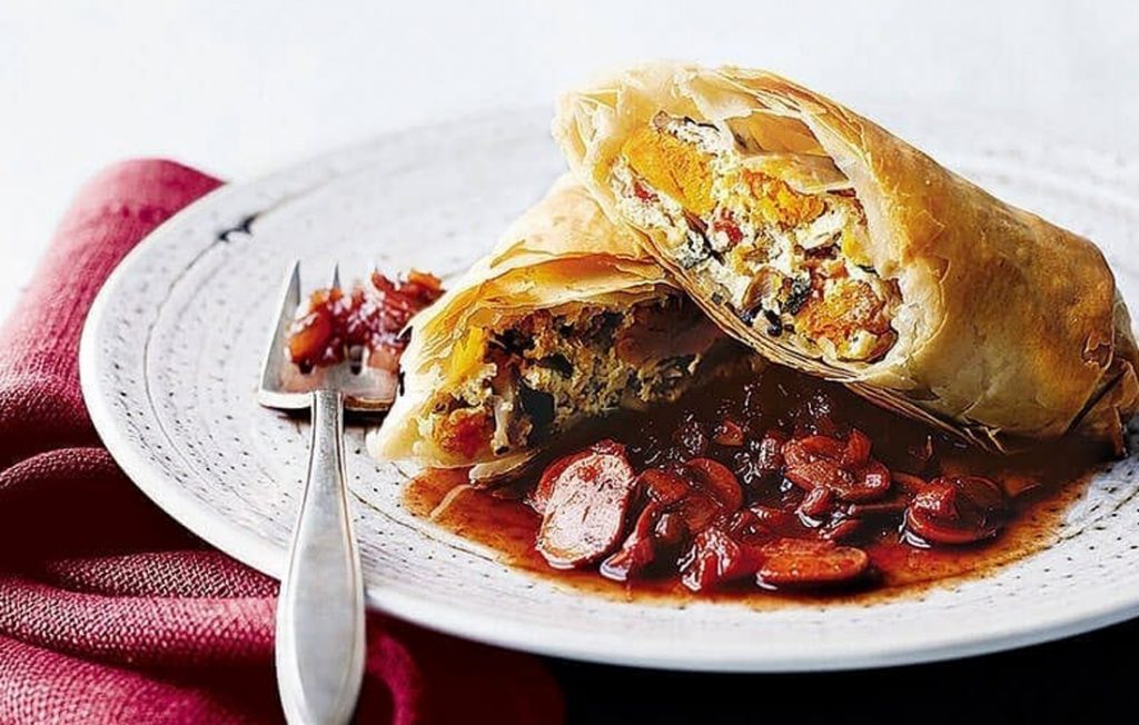 3 افرد ورقة من عجينة الفيلو ورشها بخفة بالزيت. اطوها من نصفها، من جانب قصير إلى الآخر. ضع سدس حشوة القرع على العجينة، بعيدًا 1 سم من أحد الأطراف القصيرة. اطوِ أحد الجوانب الطويلة فوق الحشوة لتغطيتها تقريبًا، ثم استمر في الطي لتشكيل رزمة أنيقة. ضعها على صينية الخبز ورشها بالقليل من الزيت. كرر العملية مع أوراق العجينة والحشوة المتبقية. اخبز لمدة 30 دقيقة أو حتى تصبح مقرمشة وذهبية اللون.