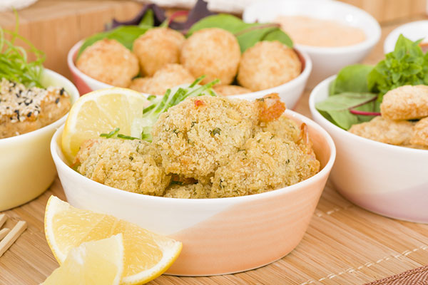 4. سخني زيت دوار الشمس في مقلاة، وقومي بملء ملعقة من الخليط، واحدة تلو الأخرى، واقليها في الزيت الساخن لدقائق، حتى تصبح كل جهة منها ذهبية اللون، فيما يتحوّل لون الروبيان إلى الزهري.