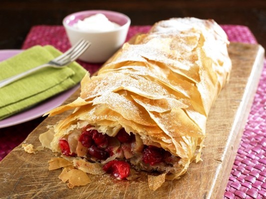 5- ينقل الحشو بواسطة الملعقة إلى وسط الفطيرة، مع إيداع مسافة 5 سنتيمترات عند الجوانب، ثم تطوى وتدهن بالزبدة، وتستخدم المنشفة للمساعدة على لفّها ونقلها إلى الفرن، وينثر السكر الناعم عليها.
