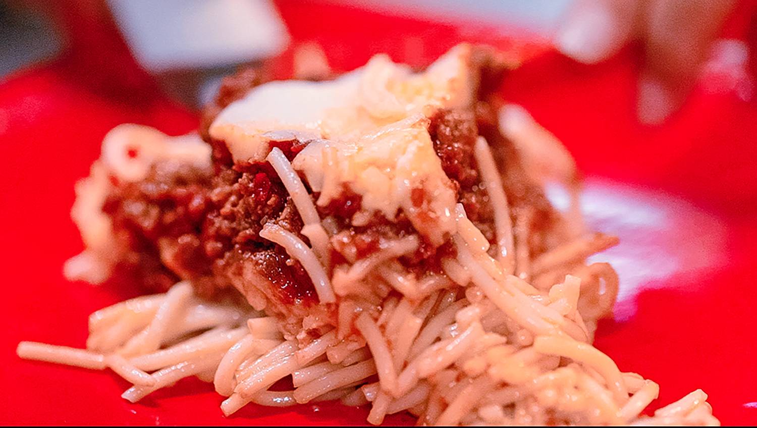 توضع ملعقة من الصوص باللحم على المكرونة ثم توضع باقى كمية الجبنةالموتزاريلا و تخبز فى الفرن على درجة حرارة 160 من 15 الى 20 دقيقة ثم ترفع و تترك لتبرد لمدة 10 دقائق قبل التقطيع ثم تقدم مزينة بالبقدونس االمفروم بالهنا.