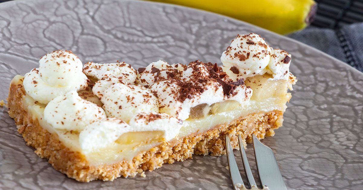 6- إدهني طبقة البسكويت بالحليب المكثف المحلّى بنكهة الكراميل. أضيفي شرائح الموز. ضعي الكريمة المخفوقة في كيس الحلويات وزيّني وجه الفطيرة.