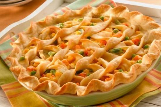 - لعمل شكل أخر من فطيرة الدجاج، تُقسم باقي كمية العجين إلى نصفين متساويين، يُفرد كلاهما بالنشابة على سطح أملس مرشوش بقليل من الدقيق حتى يتخذان شكلاً دائرياً.