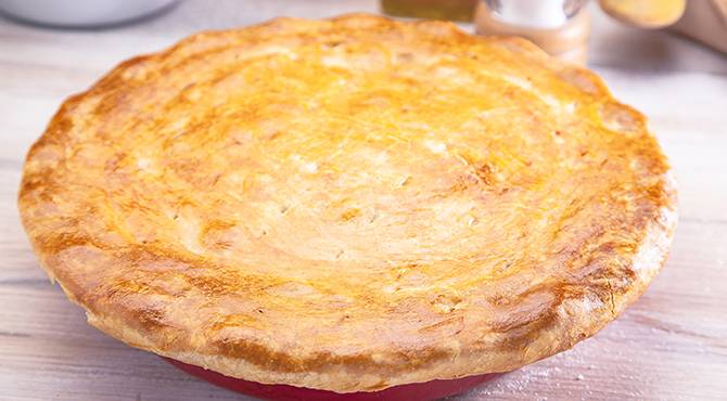 يوضع خليط الدجاج في قدر ويصب الخليط السائل الساخن عليه. يغطى بالقشرة، تُختم الحواف وتقص بواقي العجينة. تصنع بعض الشقوق الصغيرة على الوجه حتى تسمح للبخار بالخروج.