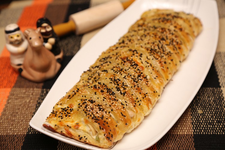 5. وزعي خليط الدجاج بمنتصف العجينة، وزيدي شرائح من التيركي، وجبن البارميزان المبشور، وجدّلي العجينة.