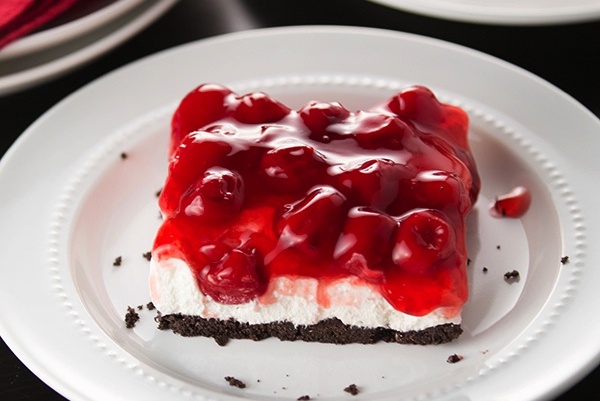 7. باستخدام ملعقة وزعي حشوة الكرز على الوجه وأعيدي الطبق للثلاجة لبيرد تمام ثم قدميه