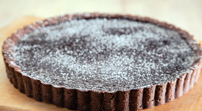 تخرج العجينة من البراد وتفرد بشكل قرص مسطح، ثم تنقل إلى القالب المدهون. تثقب العجينة بشوكة ثم توضع في البراد لـ20 دقيقة قبل الخبز.